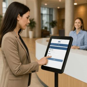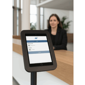 Een representatieve iPad-standaard met touchscreen waarop bezoekers hun kenteken kunnen aan- en afmelden. De zuil is gekoppeld aan het systeem van de gemeente Rijswijk en werkt volledig zelfstandig in kioskmodus.